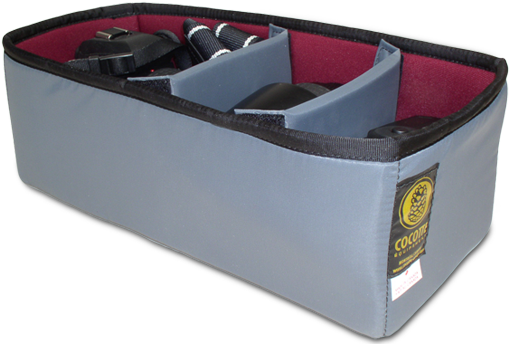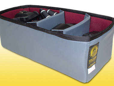 This customable insert, with the included 3 dividers, will accommodate a dslr with up to 3 lenses and a flash. |
